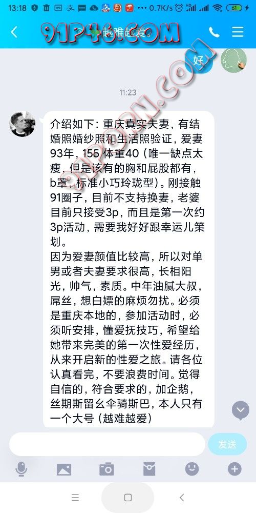 我们是重庆真实夫妻,有结婚照婚纱照和生活照验证,爱妻93年,155 体重40(唯一缺点太瘦,但是该有的胸和屁股都有,b罩,标准小巧玲珑型)。刚接触91圈子,目前不支持换妻,老婆目前只接受3p,而且是第一次约3p活动,需要我好好跟幸运儿策划。